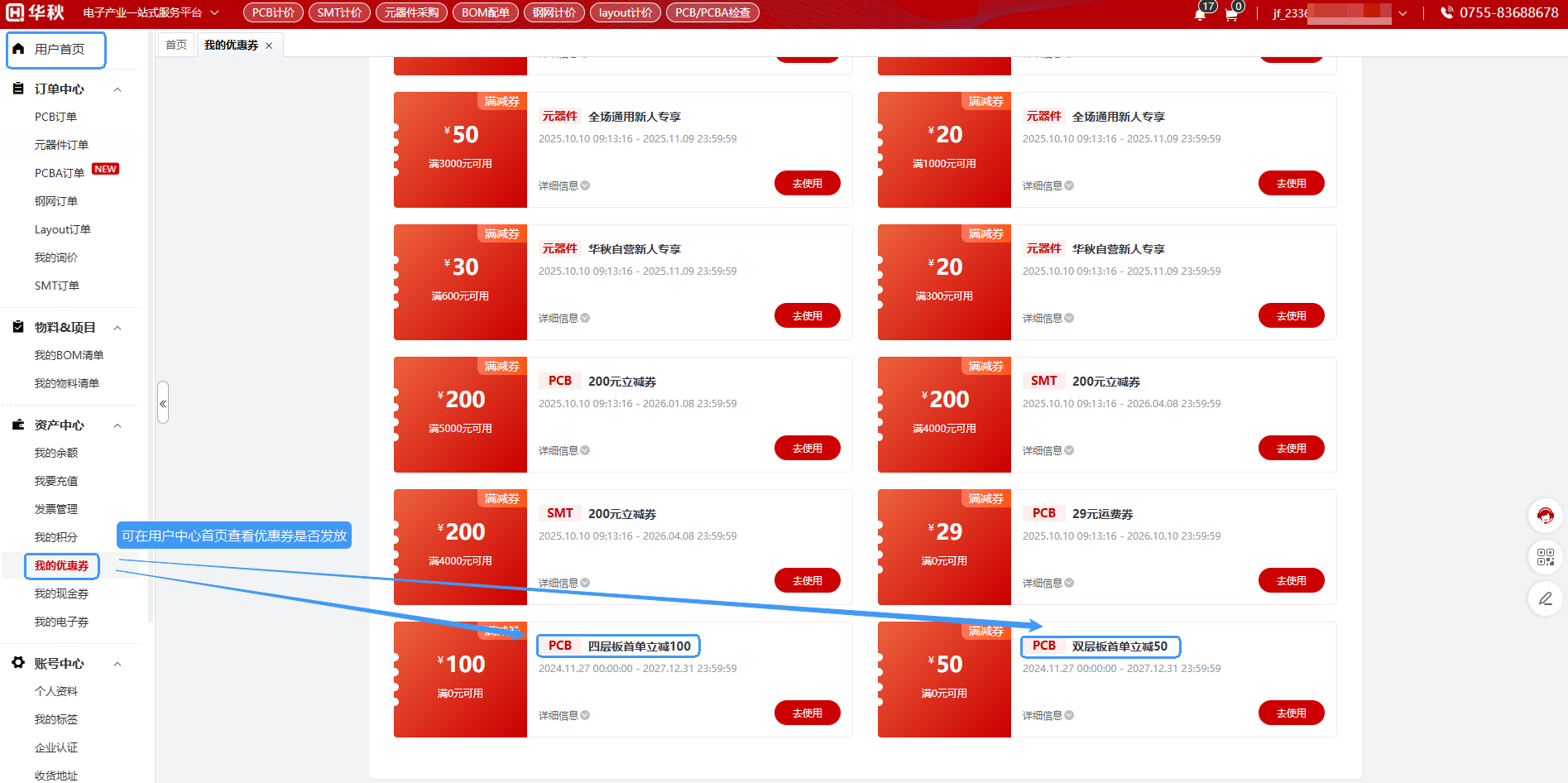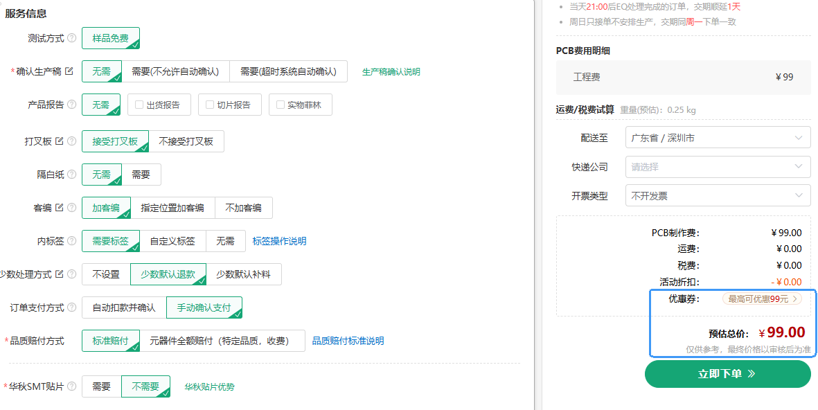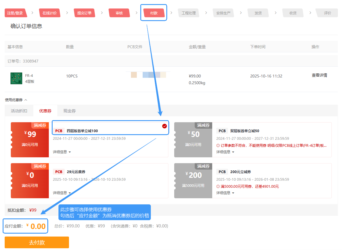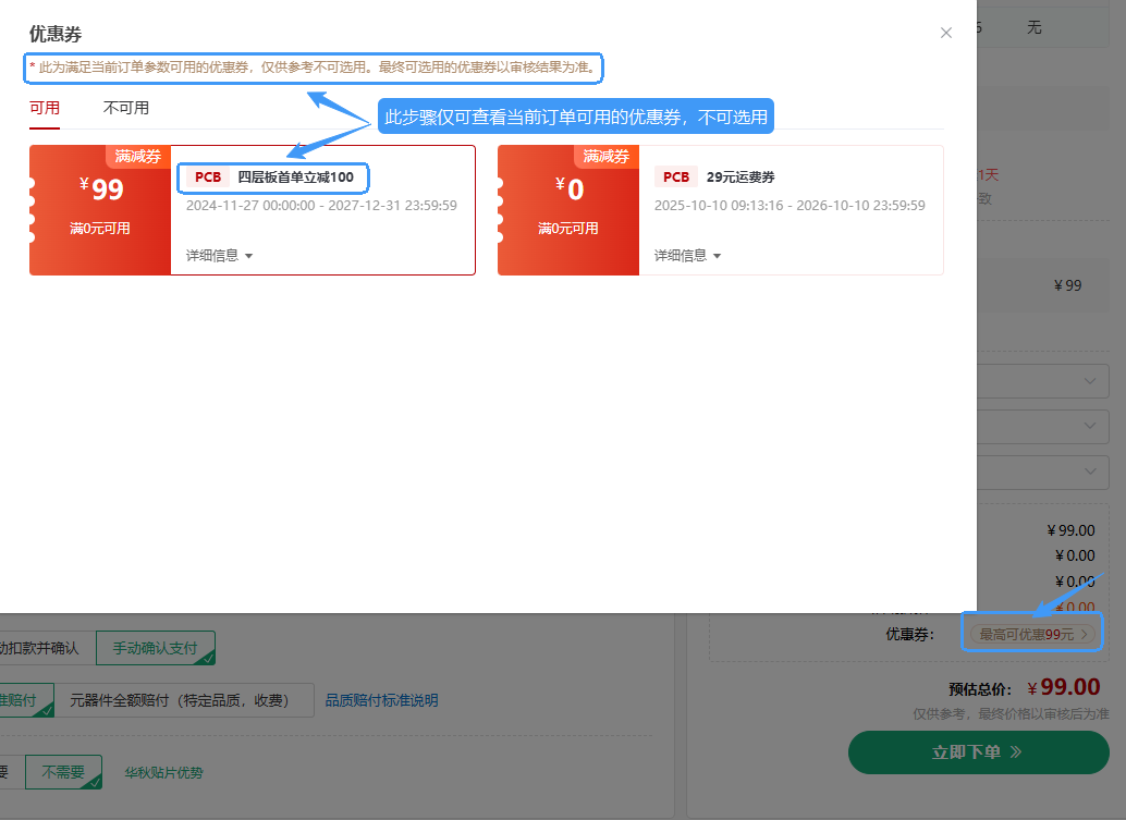 1)上傳完P(guān)CB文件并填寫下單參數(shù)后,下單界面僅顯示賬戶已有的可用優(yōu)惠券,實際使用時需在付款界面手動選擇;