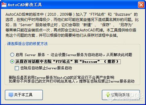 AutoCAD修改工具是一款可以幫助你解決AutoCAD出現(xiàn)的問題。AutoCAD后來的版本中加入了“FTP站點(diǎn)”和“Buzzsaw”的選項(xiàng),在我們平時(shí)用得極少,而他們卻可能在某些情況下造成莫名其妙的問題。比如,當(dāng)“Server”服務(wù)被停止時(shí),它們會(huì)導(dǎo)致“新建”、“保存”、“另存為”等菜單只能在安裝后點(diǎn)一次,再點(diǎn)即會(huì)立刻讓AutoCAD死掉。
