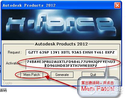 9. 點(diǎn)擊 Generate 算出激活碼,并點(diǎn)擊 Mem Patch 鍵,否則無法激活,提示注冊(cè)碼不正確。