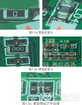 常見(jiàn)的焊盤(pán)尺寸方面的問(wèn)題有焊盤(pán)尺寸錯(cuò)誤、焊盤(pán)間距過(guò)大或過(guò)小、焊盤(pán)不對(duì)稱、兼容焊盤(pán)設(shè)計(jì)不合理等,焊接時(shí)容易出現(xiàn)虛焊、移位、立碑等不良現(xiàn)象。如圖1.5a、1.5b和1.5c所示。