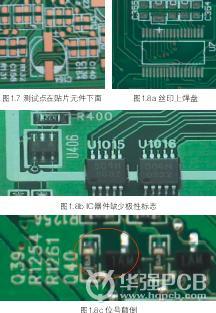 8 、絲印或阻焊在焊盤(pán)、測(cè)試點(diǎn)上,位號(hào)或極性標(biāo)志缺失,位號(hào)顛倒,字符過(guò)大或過(guò)小等。如圖1.8a、1.8b和1.8c所示。