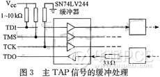 為保證信號(hào)的完整性,本文對(duì)來(lái)自測(cè)試裝置的主TAP控制信號(hào)進(jìn)行了緩沖處理,同時(shí)用上拉電阻將TDI、TMS信號(hào)拉至邏輯1狀態(tài),將TCK下拉接地。另外,在最后一個(gè)器件的TDO和被測(cè)板的TDO端口之間放置一個(gè)20 Ω的電阻以衰減反射。緩沖器類(lèi)型的選用要參考電路板上器件的電平類(lèi)型。如圖3所示,被測(cè)板上邊界掃描器件工作電壓為3.3 V,本文選用的緩沖器SN74LV244的工作電壓為2.7 V~5.5 V,可以滿(mǎn)足需要。