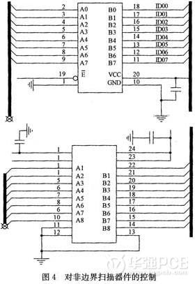 為了增加可控制性,對(duì)于非邊界掃描器件的重要的控制信號(hào),如片選端和使能端,盡可能地直接控制,或者通過(guò)邊界掃描器件的邊界掃描單元進(jìn)行控制。這樣在測(cè)試時(shí),為了避免信號(hào)沖突可以把相應(yīng)的器件禁用或者改變信號(hào)輸入輸出的方向。如圖4所示,器件N17(SN74LVC4245A)的/OE端和DIR端與N14(EPLD)的引腳相連。N50(74F245)的/E端也受N14控制,而DIR端接地,N50的/E端選通時(shí),固定的B端為輸入而A端為輸出。N17和N50的A端引腳共享VXI總線(xiàn)的D00-D07,但B端引腳分別連在不同的總線(xiàn)上。如果N17的/OE端選通,DIR端置0時(shí),A端為輸入,與N50的A端為輸出相矛盾;DIR端置1時(shí),B端為輸入,不同的總線(xiàn)信號(hào)發(fā)送到同一引腳上,引起沖突。因此,通過(guò)N14的BS引腳控制N17和N50,讓兩個(gè)器件不同時(shí)選通,使測(cè)試順利進(jìn)行。