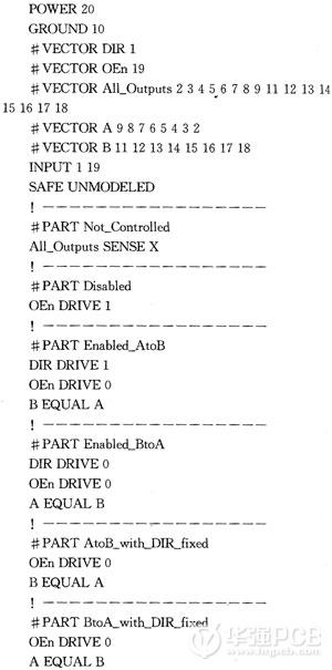 在此MODEL中,描述了器件的引腳性質(zhì)及各種狀態(tài)下的邏輯功能。MODEL被分成了若干PART,要根據(jù)電路板上器件的具體連接情況來(lái)選取相應(yīng)的PART。對(duì)于N50和N51來(lái)說(shuō),因DIR引腳接地,固定為低,我們就選取PARTBtoA_with_DIR_fixed