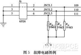 在做互連測(cè)試時(shí),建模的器件越多,故障覆蓋率就越高。本文做了一個(gè)對(duì)比實(shí)驗(yàn)。如圖5所示。N14的109、110和111這3個(gè)引腳分別與3個(gè)上拉電阻相連,同時(shí)與插針J6相連。通過(guò)跳線(xiàn)可以使3個(gè)引腳處于001~111這7個(gè)狀態(tài)中的某一個(gè),從而確定被測(cè)板電路響應(yīng)VXI總線(xiàn)中7根中斷線(xiàn)中的某一根。在向測(cè)試軟件輸入被測(cè)板的信息時(shí),我們默認(rèn)109~111這3個(gè)引腳正常狀態(tài)為邏輯高。那么,當(dāng)我們用跳線(xiàn)將J6的1、2 腳短接時(shí),就人為制造了N14的109腳與地短路的故障。