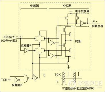 采用IDDT和邊界掃描方法是解決總線互連缺陷的一種測(cè)試技術(shù)示。在本例中一個(gè)內(nèi)置傳感器被集成進(jìn)了系統(tǒng)中。該傳感器是一個(gè)片上電流鏡像,可以將散亂的電荷轉(zhuǎn)換成相關(guān)的測(cè)試時(shí)間。噪聲檢測(cè)器(ND)和偏移檢測(cè)器(SD)單元都是基于改進(jìn)的串耦PMOS差分傳感放大器,因此價(jià)格十分便宜。這些單元緊鄰互連的端末,對(duì)實(shí)際信號(hào)和噪聲進(jìn)行取樣。每當(dāng)噪聲或偏移高于可接受的限值時(shí),這些單元就產(chǎn)生1到0的跳變,并存儲(chǔ)于觸發(fā)器中,以便于進(jìn)一步分析。