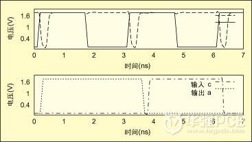 本例所用的ILS是如圖2所示的時(shí)延破壞傳感器??山邮艿臅r(shí)延范圍(ADR)被定義為觸發(fā)時(shí)鐘沿開始的一段時(shí)間,所有輸出跳變必須在這段時(shí)間內(nèi)發(fā)生。測(cè)試時(shí)鐘用于創(chuàng)建窗口,以確定可接受的偏移范圍。如果輸入信號(hào)a的跳變發(fā)生在b為邏輯’0’的時(shí)間內(nèi),那么信號(hào)a就在可接受的時(shí) 延范圍內(nèi)。任何在b為邏輯’1’的時(shí)間內(nèi)發(fā)生的跳變均經(jīng)過傳輸門傳遞給XNOR門,這是利用動(dòng)態(tài)預(yù)充電邏輯實(shí)現(xiàn)的。根據(jù)合理的時(shí)延范圍調(diào)整反向器1。在b 為1的時(shí)間內(nèi)有信號(hào)跳變時(shí)輸出c就為1,直到b變?yōu)?,開始下一個(gè)預(yù)充電循環(huán)周期。輸出用來觸發(fā)一個(gè)觸發(fā)器。圖3所示為輸入信號(hào)a有2個(gè)信號(hào)跳變的單元 SPICE仿真,采用0.18μm技術(shù)實(shí)現(xiàn)。第1個(gè)信號(hào)跳變發(fā)生在0.2ns處,當(dāng)時(shí)b為0,輸出保持為0。第2個(gè)信號(hào)跳變發(fā)生在3.5ns處,此時(shí)b為1,由于超出了可接受的時(shí)延周期,輸出c保持為1直到b變?yōu)?。時(shí)延傳感器還能檢測(cè)到由串話引起的跳變錯(cuò)誤。脈沖可以被反饋到觸發(fā)器以存儲(chǔ)時(shí)延發(fā)生事件,供以后進(jìn)一步閱讀/分析。