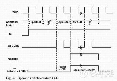 在掃描輸出過程中,我們需要捕獲輸出F信號(hào)并送至FF1。在本例中sel應(yīng)置為0,因此SI和ShiftDR應(yīng)分別為1和 0。當(dāng)掃描輸出過程開始后,D1被傳送到Q1,并用作下一個(gè)單元的TDI。信號(hào)完整性信息被捕獲進(jìn)FF1后ILS觸發(fā)器復(fù)位。在將F值送至Q1后,必須格式化掃描鏈。在本例的Shift-DR狀態(tài)期間,TDI輸入必須連接至FF1。因此必須將sel置為1(SI=’1’,ShiftDR=’1’)從而隔離出ILS路徑。如圖5所示,SI和ShiftDR需要進(jìn)行或操作,以選擇和發(fā)送信號(hào)F到D1,并生成掃描輸出用的掃描鏈。