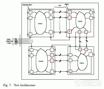 圖7給出了針對(duì)小型SoC的整體測(cè)試架構(gòu),其中的JTAG輸入(TDI、TCK、TMS、TRST和TDO)使用時(shí)沒加任何修改。但定義了一條新的指令,主要用于信號(hào)完整性測(cè)試中讀取測(cè)試結(jié)果。從圖7可以看到,只是每個(gè)互連的接收端單元改成了OBSC。對(duì)于雙向互連,OBSC 單元用于Core j和Core1之間的雙側(cè)。其它單元都是標(biāo)準(zhǔn)BSC,在信號(hào)完整性測(cè)試模式期間出現(xiàn)在掃描鏈中。ILS的作用是獨(dú)立的,不需要特殊的控制電路來控制這類單元的時(shí)序。由F顯示的完整性信息被掃描輸出,用以確定有問題的互連。