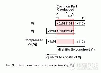 這種壓縮技術(shù)有二個(gè)關(guān)鍵點(diǎn)。首先,我們的方法是一個(gè)簡(jiǎn)捷的無損壓縮法,通過確定相鄰二個(gè)模式間的最大相似性并覆蓋它們來構(gòu)筑壓縮位流。其次,由于這種壓縮法即無破壞性也不對(duì)模式重新排序,因此不需要額外的解壓縮硬件。而且僅是利用自動(dòng)測(cè)試設(shè)備(ATE)通過控制JTAG TMS控制輸入端執(zhí)行解壓縮過程。當(dāng)測(cè)試模式產(chǎn)生后,常會(huì)有大量無關(guān)緊要的模式出現(xiàn)在測(cè)試模式集中。針對(duì)信號(hào)完整性產(chǎn)生的模式也是這樣,特別是在考慮了地區(qū)度量標(biāo)準(zhǔn)時(shí)(限制開發(fā)模式空間)更是如此。在任何情況下我們都假設(shè)測(cè)試集由相同長(zhǎng)度的包含不重要的模式組成。圖9表達(dá)了我們的基本壓縮想法,即充分利用不重要的部分覆蓋盡可能多的位來完成2個(gè)模式Vi和Vj(長(zhǎng)度是1_16)的壓縮。