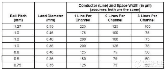 (注:Ball pitch: 球間距;Land Diameter: 觸點(diǎn)直徑;conductor (Line) and space width(in μm): 導(dǎo)線(走線)和空間寬度(μm內(nèi));Assumes both are the same: 假定兩者都相同)