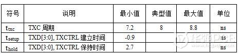 下面分析該P(yáng)HY芯片和MAC間TX通道的時(shí)序。表3和表4分別是該百兆PHY芯片和MPU內(nèi)部MAC的TX通道時(shí)序參數(shù)表。