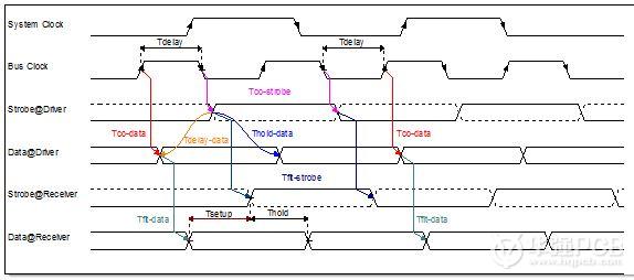 很顯然,Tco、Tflt-data 、Tflt-clk中,Tco是器件的固有參數(shù),Tflt-data 和Tflt-clk取決于對(duì)應(yīng)的PCB走線長度和走線層等。如果Tflt-data 和Tflt-clk的差過小,則導(dǎo)致數(shù)據(jù)的保持時(shí)間不足;如果過大,則會(huì)使得建立時(shí)間不足。因此,Tflt-data 和Tflt-clk的差存在上限和下限雙重限制。