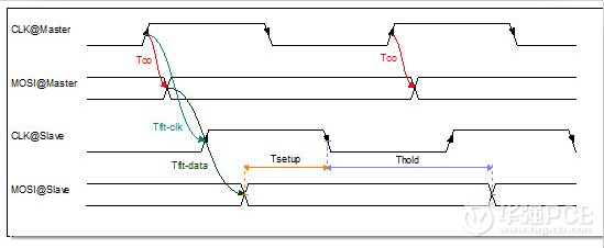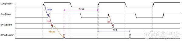 圖3是基于本模型的數(shù)據(jù)讀時(shí)序關(guān)系圖。圖中參數(shù)含義與前述相同。需要注意的是:在讀關(guān)系中,時(shí)鐘首先需要從主控端傳到從端,待從端發(fā)出的數(shù)據(jù)回到主控端后,才能由主控端對(duì)數(shù)據(jù)進(jìn)行采樣。因此,建立和保持時(shí)間的公式如下: