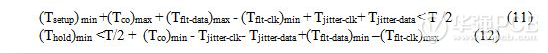 (Tsetup)min + (Tco)max + (Tflt-data - Tflt-clk)max + Tjitter-clk+ Tjitter-data < T (1)
