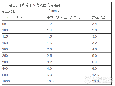 表二:爬電距離(適用于基本絕緣、工作絕緣 ② 、加強絕緣)