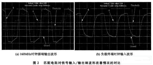 圖2(a)是沒有加入匹配電阻的情況,可以明顯看到輸出端A的波形有一個(gè)大的下沖(大約1 V左右),而且波形最大幅度已經(jīng)達(dá)到4 V(I/O信號(hào)是3.3 V),有很明顯的反射迭加現(xiàn)象。輸入端B的波形相當(dāng)不好,由于反射造成的波形下沖和過(guò)沖點(diǎn)的信號(hào)幅值已經(jīng)接近門檻電平,這樣的時(shí)鐘信號(hào)很容易造成觸發(fā)器的錯(cuò)誤操作。圖2(b)是在靠近源輸出端加入了一個(gè)47 Ω的匹配電阻后的波形,可以看到A和B的波形都有了明顯的改善。 結(jié) 語(yǔ)