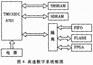 在正交頻分復用OFDM調(diào)制解調(diào)系統(tǒng)中,時鐘率高達167MHz,時鐘沿時間為0.6ns,系統(tǒng)構成中有TMS320C6701 DSP以及SBSRAM、SDRAM、FIFO、FLASH和FPGA(如圖4所示)。其中FIFO采用異步FIFO,主要用作與前端接口的數(shù)據(jù)緩存;DSP的DMA高速地將數(shù)據(jù)搬移到SBSRAM或者SDRAM中;DSP處理完數(shù)據(jù)由多通道緩沖串口(MCBSP)將BIT流輸出到FPGA中進行解碼處理。由于系統(tǒng)工作在很高的時鐘頻率上,所以系統(tǒng)的信號完整性問題就顯得十分重要。