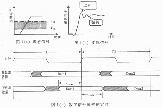 信號完整性SI(Signal Integrity)涉及傳輸線上的信號質量及信號定時的準確性。在數(shù)字系統(tǒng)中對于邏輯1和0,總有其對應的參考電壓,正如圖1(a)中所示:高于ViH的電平是邏輯1,而低于ViL的電平視為邏輯0,圖中陰景域則可視為不確定狀態(tài)。而由圖1(b)可知,實際信號總是存在上沖、下沖和振鈴,其振蕩電平將很有可能落入陰影部分的不確定區(qū)。信號的傳輸延遲會直接導致不準確的定時,如果定時不夠恰當,則很有可能得到不準確的邏輯。例如信號傳輸延遲太大,則很有可能在時鐘的上升沿或下降沿處采不到準確的邏輯。一般的數(shù)字芯片都要求數(shù)據(jù)必須在時鐘觸發(fā)沿的tsetup前即要穩(wěn)定,才能保證邏輯的定時準確(見圖1(c))。對于一個實際的高速數(shù)字系統(tǒng),信號由于受到電磁干擾等因素的影響,波形可能會比我們想象中的更加糟糕,因而對于tsetup的要求也更加苛刻,這時,信號完整性是硬件系統(tǒng)設計的一個至關重要的環(huán)節(jié),必須加以認真對待。