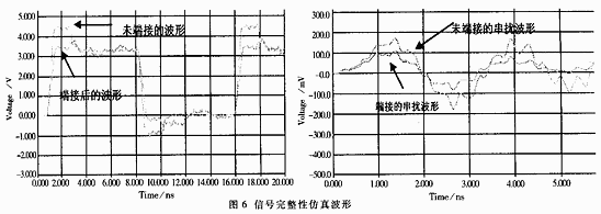 第三點是解決信號的反射、串擾噪聲問題。這一點在一高速系統(tǒng)中顯得尤其重要,解決的辦法是通過采用先進的EDA工具,選擇正確的布線策略和端接方式,從而得到的理想的信號波形。在設計本系統(tǒng)時,基于IBIS模型,使用Hyperlynx進行設計前仿真。根據(jù)仿真結果,選擇出最優(yōu)的布線策略。圖6為端接和未加端接的信號波形及串擾波形圖,從圖中可以看到端接對消除反射、振蕩和串擾到了明顯的作用。