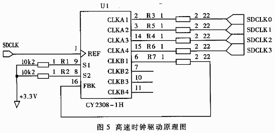 其次是對系統(tǒng)中高速時鐘信號與關鍵信號進行完整性設計。與SBSRAM接口的時鐘高達16MHz,與SDRAM接口的時鐘高達80MHz,時鐘信號傳輸處遲大小和信號質量的優(yōu)劣將直接關系到系統(tǒng)的定時是滯準確。在設計布局布線時,總是優(yōu)考慮這些重要的時鐘線,即通過規(guī)劃時鐘線,使得時鐘線的連線遠離其它的信號線;連線盡量短,并且加上地線保護。本系統(tǒng)中由于要求大量存儲器(使用了4片SDRAM),對于要求較高的同步時鐘來說,如果采用星型布線,就很難保證時鐘的扇出能力,而且還將導致PCB布線尺寸的增大,從而直接影響信號完整性。因此很有必要采用時鐘緩沖器來產(chǎn)生4個同相的、延遲極小且一致的時鐘,分別接到4片SDRAM上,這樣不但增加了時鐘信號的驅動能力,同時秀好地保證了信號完整性(如圖5的所示)。對于其它的關鍵信號諸如FIFO的讀寫信號等,也應盡心設計。