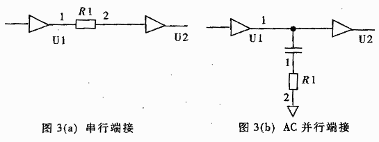 有時候在PCB板尺寸要求很苛刻的情況下,未必能夠保證并行線間的足夠空間,因此要適當改變布線策略,盡可能地保護比較重要的信號線,并依靠端接來大幅度地消除串擾?;诓煌牟季€拓撲結構,端接的策略也可能不同,主要有以下三種方式:單贈載網(wǎng)絡一般采用串行端接;菊花鏈結構一般采用AC并行端接;星形布線一般也采用AC并行端接(如圖3所示)。