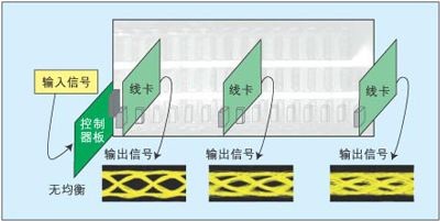 圖2顯示了相對(duì)于早先圖中相同的背板而言信號(hào)所產(chǎn)生的變化,圖中在鏈路的接收端增加了一個(gè)有源濾波器(Vitesse VSC7104)。注意到在背板的每個(gè)點(diǎn)上接收的均衡信號(hào)實(shí)質(zhì)上是相同的,這表明了有源均衡器的抖動(dòng)平衡能力。
