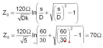 例如,如果算上glass weave和樹脂介電常數(shù)為5,間隙是60密耳,導通孔的直徑是30密耳,那么其差分阻抗是: