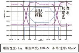圖3中六邊形的部分和矩形的邊框為眼圖的測試模板,其他部分為接收端的眼圖。對于LVPECL電平而言,噪聲容限為200mV。輸出電壓典型值為800mV,最大閾值電壓為300mV。ADS5463的上升時間和下降時間的典型值為500ps(注:這里的上升時間和下降時間指的是上升沿和下降的20%到80%這一段長度所占用的時間)。根據(jù)這些參數(shù)我們設定用于眼圖測試的模板。用于眼圖測試的模板是圖3中的六邊形。