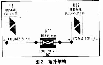 發(fā)射端為HY57V561620的44引腳,接收端為Cyclone II的60引腳,激勵為66 MHz的方波。圖2為拓?fù)浣Y(jié)構(gòu),圖3為仿真波形。