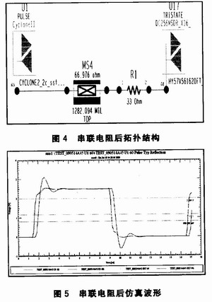 由仿真波形可以看出,由信號反射引起了波形畸變,產(chǎn)生了明顯的振鈴現(xiàn)象。振鈴現(xiàn)象的存在,使信號多次跨越電平邏輯門限從而導(dǎo)致邏輯功能紊亂。減小振鈴噪聲的一種有效手段是在電路中串聯(lián)一個小電阻,該電阻為電路提供了阻尼,能顯著減小振鈴幅度,縮短振鈴震蕩時間,同時幾乎不影響電路速度。在工程使用上,該電阻通常為33 Ω。串聯(lián)電阻后的拓?fù)浣Y(jié)構(gòu)和仿真波形如圖4和圖5所示。