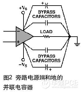 直接從運算放大器的電源引腳入手;具有最小電容值和最小物理尺寸的電容器應(yīng)當與運算放大器置于PCB的同一面——而且盡可能靠近放大器。電容器的接地端應(yīng)該用最短的引腳或印制線直接連至接地平面。上述的接地連接應(yīng)該盡可能靠近放大器的負載端以便減小電源端和接地端之間的干擾。圖2示出了這種連接方法。