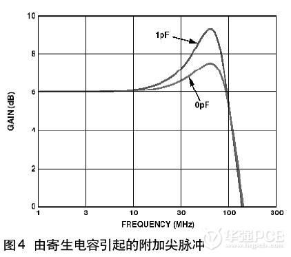 在高速電路中,很小的值就會影響電路的性能。有時候幾十個皮法(pF)的電容就足夠了。相關(guān)實例:如果在反相輸入端僅有1pF的附加寄生電容,它在頻率域可以引起差不多2dB的尖脈沖(見圖4)。如果寄生電容足夠大的話,它會引起電路的不穩(wěn)定和振蕩。