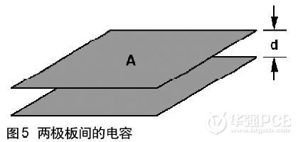 當尋找有問題的寄生源時,可能用得著幾個計算上述那些寄生電容尺寸的基本公式。公式(1)是計算平行極板電容器(見圖5)的公式。