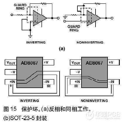 保護環(huán),或者說“隔離環(huán)”,是運算放大器常用的另一種屏蔽方法,它用于防止寄生電流進入敏感結(jié)點。其基本原理很簡單——用一條保護導(dǎo)線將敏感結(jié)點完全包圍起來,導(dǎo)線保持或者迫使它保持(低阻抗)與敏感結(jié)點相同的電勢,因此使吸收的寄生電流遠離了敏感結(jié)點。圖15(a)示出了用于運算放大器反相配置和同相配置中的保護環(huán)的原理圖。圖15(b)示出用于SOT-23-5封裝中兩種保護環(huán)的典型布線方法。