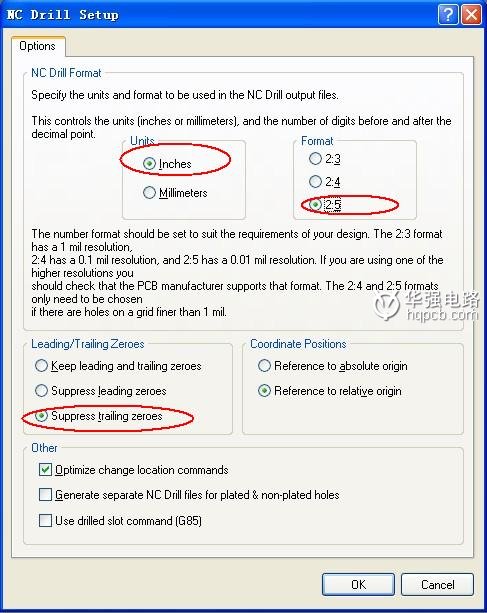 進入NC Drill Setup屬性,我們設(shè)置鉆孔文件的坐標格式及單位選擇Inches 英制 2:5