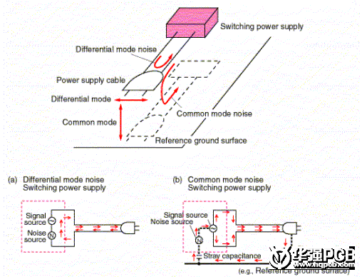 「?jìng)鲗?dǎo)式EMI」可以分成兩類(lèi):差模(Differential mode;DM)和共模(Common mode;CM)。差模也稱(chēng)作「對(duì)稱(chēng)模式(symmetric mode)」或「正常模式(normal mode)」;而共模也稱(chēng)作「不對(duì)稱(chēng)模式(asymmetric mode)」或「接地泄漏模式(ground leakage mode)」。 由EMI產(chǎn)生的噪聲也分成兩類(lèi):差模噪聲和共模噪聲。簡(jiǎn)言之,差模噪聲是當(dāng)兩條電源供應(yīng)線路的電流方向互為相反時(shí)發(fā)生的,如圖1(a)所示。而共模噪聲是當(dāng)所有的電源供應(yīng)線路的電流方向相同時(shí)發(fā)生的,如圖1(b)所示。一般而言,差模訊號(hào)通常是我們所要的,因?yàn)樗艹休d有用的數(shù)據(jù)或訊號(hào);而共模訊號(hào)(噪聲)是我們不要的副作用或是差模電路的「副產(chǎn)品」,它正是EMC的最大難題。從圖一中,可以清楚發(fā)現(xiàn),共模噪聲的發(fā)生大多數(shù)是因?yàn)椤鸽s散電容(stray capacitor)」的不當(dāng)接地所造成的。這也是為何共模也稱(chēng)作「接地泄漏模式」的原因。