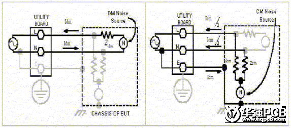 在一個(gè)真實(shí)的電源供應(yīng)電路里,差模噪聲是被一個(gè)「擺動(dòng)電流(swinging current)」,或「脈沖電流(pulsating current)」啟動(dòng)的。但是,DM噪聲源很像是一個(gè)電壓源。另一方面,共模噪聲是被一個(gè)「擺動(dòng)電壓(swinging voltage)」啟動(dòng)的。但CM噪聲源的行為卻比較像是一個(gè)電流源,這使得共模噪聲更難被消除。它和所有的電流源一樣,需要有一個(gè)流動(dòng)路徑存在。因?yàn)樗穆窂桨妆P(pán)(chassis),所以外殼可能會(huì)變成一個(gè)大型的高頻天線。