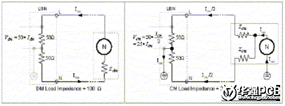 圖四:對(duì)DM和CM噪 聲源而言,LISN所代表的負(fù)載阻抗