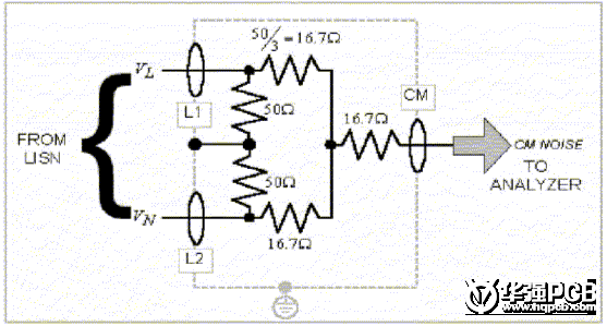 使用LISN后,就不需要分別測(cè)量CM和DM噪聲值,它們是利用上述的代數(shù)公式求得的。但有時(shí)還是需要各別測(cè)量CM和DM噪聲值,譬如:為了排除故障或診斷錯(cuò)誤。幸好有一些聰明的方法可以達(dá)到各別測(cè)量的目的。我們舉兩個(gè)例子:
