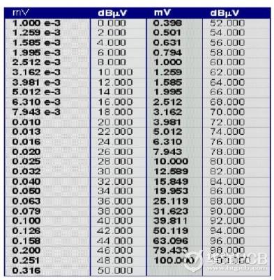 表二是dBμV與mV的快速轉(zhuǎn)換對(duì)查表,我們可以利用上述的公式來(lái)轉(zhuǎn)換dBμV、mV;或利用表二查得。