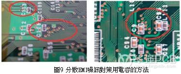 實際應(yīng)用時只要在頻率導線、Bus導線等高頻導線圖案(Pattern)附近、形成CPU、Return路徑的內(nèi)層面(Plane)的分斷附近、形成噪訊出入口的基板側(cè)面附近分散設(shè)置EMI噪訊對策用電容,就可以消除該部位周邊的噪訊。