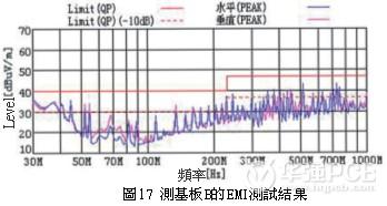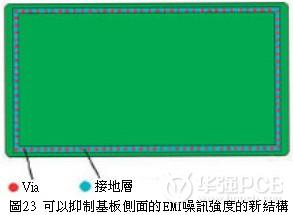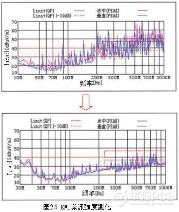 實際制作PCB時在基板側(cè)面鋪設(shè)Shield,同樣會面臨成本上升的質(zhì)疑,類似圖23在基板側(cè)面附近設(shè)置接地Plane與連續(xù)性貫穿Via的新結(jié)構(gòu),除了可是解決成本問題之外,還可以有效抑制基板側(cè)面的EMI噪訊強度;圖24是結(jié)合以上各種EMI噪訊對策的PCB測試結(jié)果。