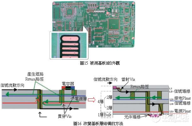 改變被測基板結(jié)構(gòu)主要理由是一般4層基板的Return路徑,通常都設(shè)有可以通行電源Plane或是最短距離接地,因此在貫穿部位經(jīng)常造成Return路徑迂回問題,如果信號導線包覆接地Plan e,如此一來大部份的Return路徑會流入接地 Plane,進而解決Return路徑迂回的困擾,被測基板B就是根據(jù)上述構(gòu)想制成 ,因此Return路徑在PCB整體減少30%,同時縮減信號圖案與Return路徑構(gòu)成的電流Loop距離,進而達成EMI噪訊抑制的目的。圖16是被測基板B的各層結(jié)構(gòu)圖。
