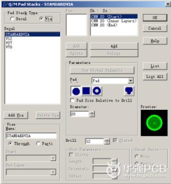 點(diǎn)擊菜單的Setup-Pad Stacks,再選擇Pad Stack Type中的Via選項(xiàng),出現(xiàn)如右圖設(shè)置對(duì)話框。