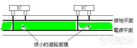若射頻電流的回傳路徑不存在,此時(shí),可以利用連接至底座的接地線路,或0V參考源來協(xié)助移 除掉不良的射頻電流。這也稱為「回路面積控制(loop area control)」。 回路面積的控制 一個(gè)被磁場感應(yīng)的回路,它的電磁場可以用電壓源來表示。這個(gè)電壓源大小和回路的總面積成正比。因此,為了降低磁場的耦合效應(yīng),必須減少回路的面積。電場「撿拾(pickup)」接收系統(tǒng)也是依靠回路面積,來形成接收天線。 當(dāng)有一個(gè)電場存在時(shí),在電源和接地平面之間,會(huì)產(chǎn)生一個(gè)電流源。電場不會(huì)在線路至線路之間耦合,而會(huì)在走線至接地線之間耦合,這就包含了共模電流。但是,對磁場而言,由于電場會(huì)伴隨它產(chǎn)生,所以電磁場會(huì)在線路至線路之間耦合,也會(huì)在走線至接地線之間耦合。 一般人都會(huì)忽略在PCB內(nèi),于電源和0V參考點(diǎn)之間要設(shè)置回路區(qū)域。附圖六的大回路面積是最容易設(shè)計(jì)的,但也最容易被「靜電釋放(ESD)」或其它場感應(yīng),變成一個(gè)天線。多層堆棧的PCB可以減輕ESD的破壞,并能減少磁場的產(chǎn)生,避免它輻射至自由空間。在附圖七中,接地平面和電源平面之間,具有一個(gè)很小的回路面積。 使用電源和接地平面可以降低電源分配系統(tǒng)的電感值。若將電源分配系統(tǒng)的特性阻抗降低,則可以降低電路板的電壓降。電壓降若變小,則「接地彈跳(ground bounce)」的現(xiàn)象就可以避免。當(dāng)邏輯閘開關(guān)快速切換時(shí),瞬間的電流變化會(huì)經(jīng)由IC接腳,傳送至主機(jī)板的電源平面或接地平面,造成輸入?yún)⒖茧妷旱牟▌?dòng),進(jìn)而產(chǎn)生射頻噪聲(RF noise)和電磁干擾,這種現(xiàn)象就稱作「接地彈跳(ground bounce)」。此外,降低特性阻抗的同時(shí),電源平面與接地平面之間的電容值會(huì)增加,這個(gè)電容值會(huì)使得任何的感應(yīng)電壓值下降,這就是「去耦合(decouple)」的效果。