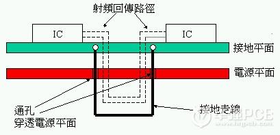 當一個訊號走線從一電路層跳至另一電路層時,射頻回傳電流應該沿著走線路徑流動。當一個走線在兩個平面結(jié)構之間,穿過一個PCB時,通常會將它們視為電源平面和接地平面,或者說這兩個平面具有相同的電位,而回傳電流在這兩個平面之間共享?;貍麟娏魑ㄒ豢梢栽谶@兩個平面之間跳接(jump),是在去耦合電容的位置上。如果這兩個平面具有相同的電位,例如:0V(參考電壓),則射頻回傳電流將會在連接兩平面的通孔處發(fā)生跳接,而此通孔是供給一個組件使用。