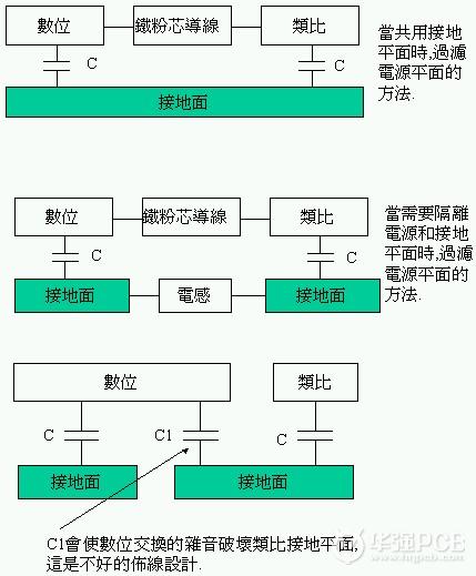 如果一個分離平面只包含低頻電路(模擬),而另一個分離平面具有高頻的交換電路(數(shù)字),這時通常需要使用鐵粉芯將它們之間的電源平面和接地平面隔離。不過,這得依照產(chǎn)品的功能和廠商對電源和平面隔離的需要而定。當不允許高頻能量在兩區(qū)域之間傳輸時,才需要使用這種技術。如果兩區(qū)域都僅包含低頻組件,而且不會受到高頻的射頻能量之威脅(例如:因高速切換所產(chǎn)生的噪聲),則不需要使用鐵粉芯組件,只要使用「單點接地(single-point ground)」(單點共同接地)即可。