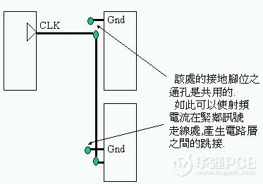 當必須在電路層之間跳接時,要如何才能減少使用接地通孔呢?在正確的PCB電路設計中,最優(yōu)先的是頻率訊號的繞線,它是屬于「人工繞線」。在對這些優(yōu)先的少數(shù)走線(例如:所有的頻率訊號和高威脅性訊號)做繞線時,PCB電路設計者的選擇是比較多的,他們可以使用最短的走線距離(shortest Manhattan length)來繞線,使跳接位置緊鄰組件的接地通孔。此跳接將共享該組件的接地腳位之通孔。對這組件而言,此接地通孔將提供0V參考電壓,并允許射頻回傳電流產(chǎn)生一個跳接。如附圖二所示。