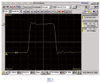 從另外一個(gè)角度來考慮,TDR設(shè)備的系統(tǒng)帶寬限制了TDR測試的分辨率。在IPC-TM-650測試手冊中對TDR設(shè)備的上升時(shí)間是按照系統(tǒng)上升時(shí)間(tsys)來定義的。當(dāng)我們要測量一臺TDR設(shè)備的系統(tǒng)上升時(shí)間時(shí),我們可以短路一臺TDR設(shè)備的輸出,此時(shí)可以測出該TDR設(shè)備的(tsys)(上升時(shí)間以及下降時(shí)間)。例如圖3的TDR設(shè)備的系統(tǒng)上升時(shí)間就高達(dá)28ps左右。